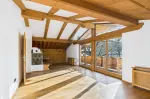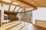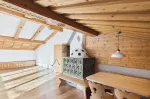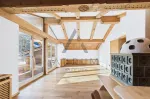 Die Einbauküche ist mit hochwertigen Siemens-Geräten ausgestattet und verfügt über einen gemütlichen Barbereich mit Sitzbank und Barhockern. Im Wohnzimmer lädt eine großzügige Eckbank mit Esstisch zum Verweilen ein, während der traditionelle Kachelofen eine besonders warme und behagliche Atmosphäre schafft.