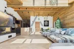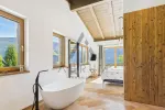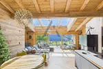 Die hochwertige Designerküche mit Geräten der Marke Miele lässt keine Wünsche offen. Sie umfasst Kühlschrank, Spüle, Spülarmatur, Backofen mit Mikrowellenfunktion, Dampfgarer, Einbau-Kaffeemaschine, Weinkühlschrank, Induktionskochfeld und Dunstabzug. Im offenen Wohnbereich sorgen ein Kaminofen und ein gemütliches Daybed für besondere Wohlfühlmomente. Die große Fensterfront mit 3-fach-Verglasung und Schiebeelementen in Holzoptik führt auf die über 40 m² große Terrasse, die einen unvergleichlichen Blick in den Nationalpark Hohe Tauern bietet. Ein kleiner Abstellraum ergänzt den großzügigen Wohn- und Essbereich.