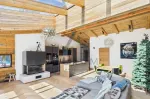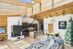 Über das Stiegenhaus oder den Personenaufzug gelangt man direkt in das Penthouse. Der großzügige Eingangsbereich mit Gäste-WC vermittelt bereits beim Betreten ein Gefühl von Weite und Eleganz. Eine große Flügeltür öffnet sich in den zentralen Wohn- und Essbereich, der mit einem Sichtdachstuhl aus Altholz und einer beeindruckenden 3x4 Meter großen Dachverglasung ausgestattet ist, die den Raum mit Licht durchflutet und eine besondere Atmosphäre schafft.
