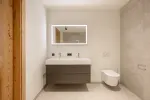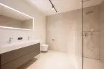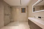 Im Untergeschoss befinden sich ein großzügiges Schlafzimmer mit Bad en suite, ein stilvoller Wellnessbereich mit integrierter Sauna sowie ein Technik- und Abstellraum. Zwei weitere Schlafzimmer, jeweils mit eigenem Bad, sind im Erdgeschoss untergebracht, das zusätzlich über einen praktischen Wirtschaftsraum verfügt.