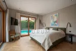 Im ersten Obergeschoss befinden sich zwei großzügige Schlafzimmer mit je Bad en suite und Zugang zu der uneinsichtigen traumhaften Südterrasse mit Pool und Blick auf Wiesen und Berge.