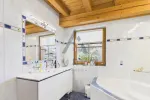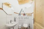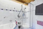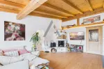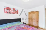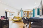 Die größere Einheit mit rund 100 m² erstreckt sich ebenfalls über das Erdgeschoss und das Obergeschoss. Im Erdgeschoss befinden sich Eingangsbereich mit Garderobe, Speis sowie ein praktischer Waschraum. Über eine Treppe gelangt man in das Obergeschoss, wo sich der großzügige Wohnbereich mit Küche, Ess- und Wohnzone samt Kamin als Herzstück der Wohnung präsentiert. Von hier aus besteht Zugang zu einem ca. 20 m² großen Balkon. Ergänzt wird diese Etage durch ein Schlafzimmer mit Balkon und Bad en suite, ein separates WC sowie ein weiteres Zimmer, das aktuell als Arbeitszimmer genutzt wird und sich flexibel als zusätzliches Schlafzimmer eignet. Ein weiteres, Duschbad ist ebenfalls vorhanden.