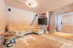 Über eine stilvolle Holztreppe erreichen Sie das Obergeschoss mit drei Schlafzimmern mit Doppelbetten, einem gemütlichen Wohnbereich mit Couch sowie einem Badezimmer mit WC, Waschtisch und Dusche.