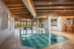 Der Wellnessbereich bietet ein Hallenbad, eine Sauna und direkten Zugang zur Terrasse und zum Garten. Auch vom gemütlichen Wohnzimmer gelangt man unmittelbar ins Freie.