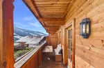 The apartment features two bedrooms, two bathrooms (with underfloor heating), an entrance hall, and a spacious living and dining area with a cozy wood-burning stove. Generous balconies offer breathtaking views of the Alpbach Valley.