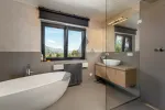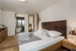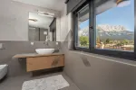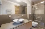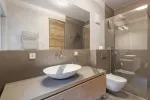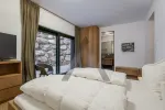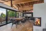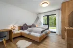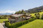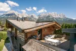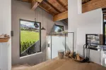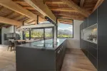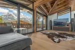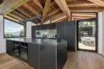 The spacious, open plan living / dining / kitchen area with modern kitchen, open fireplace and exposed ceiling beams is located on the top floor. The wonderful wrap-around balcony and deck invite to relax in the sun and enjoy the view.