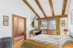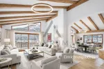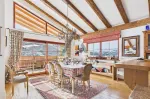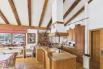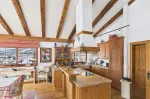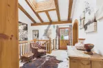 The light-filled, traditionally designed living and dining room on the top floor features an open fireplace and an open-plan kitchen and living area. The sunny balcony, accessible from both doors, offers breathtaking views of the majestic Großer Rettenstein mountain and the picturesque Brixental valley.