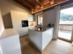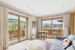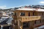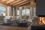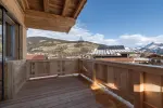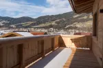 The top floor boasts another highlight: the open-plan living, dining, and kitchen area with a fitted kitchen, fireplace, exposed reclaimed wood roof trusses, breathtaking mountain views, and access to the generous balcony terraces facing both east and west.