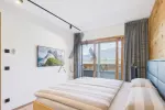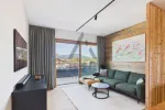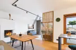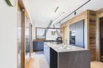 The apartment boasts exclusive furnishings with exquisite materials and thoughtful details: High-quality larch wood flooring, stylish reclaimed wood fixtures, and an open fireplace create a warm, alpine ambiance. The modern designer kitchen blends harmoniously into the open-plan living area and meets the highest standards. Venetian blinds provide optimal sun and privacy protection, while the elegant bathroom leaves nothing to be desired.